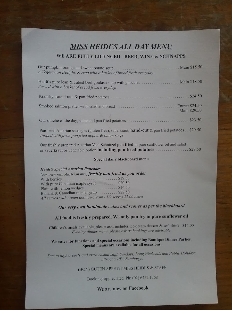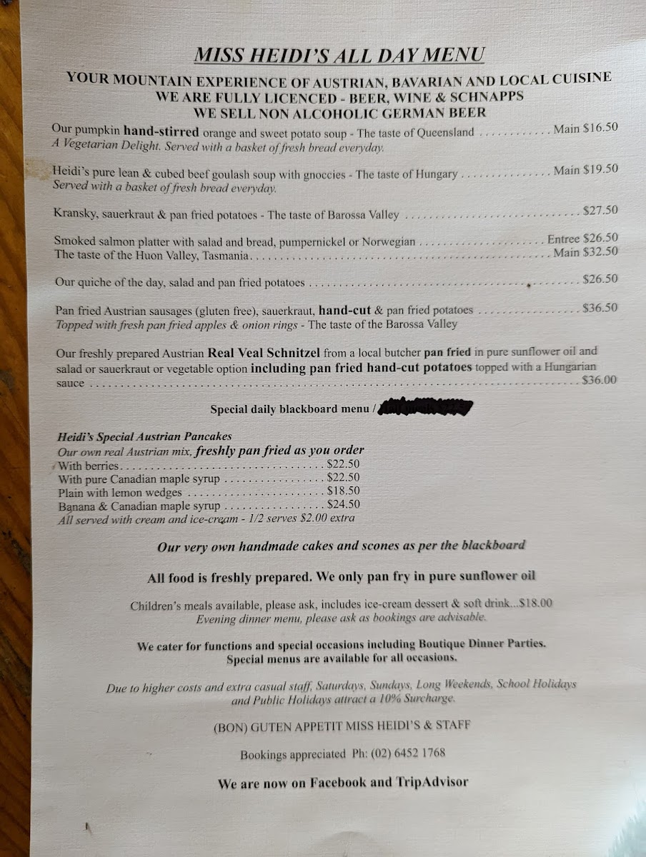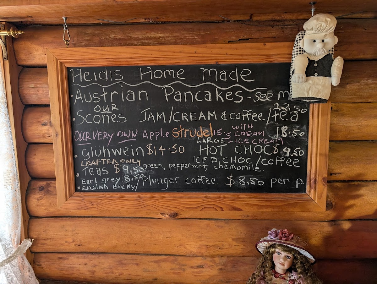 Located at Mt Gladstone Lookout near Cooma NSW, this cafe and coffee shop offers a menu featuring a variety of food and drink options inspired by Austrian and Central European cuisine. The menu is organized into several groups to cater to different dining occasions including breakfast, light meals, and casual dining.
