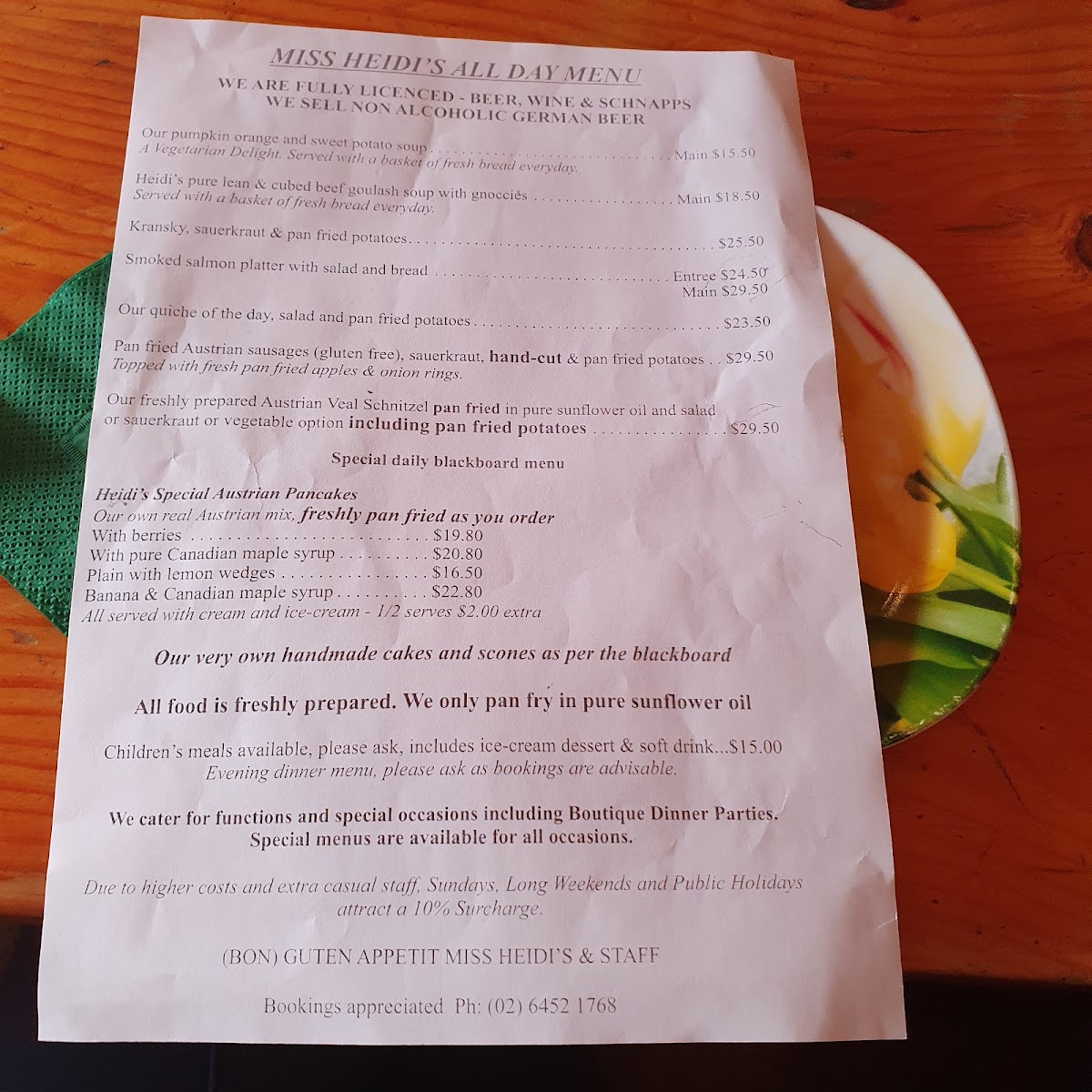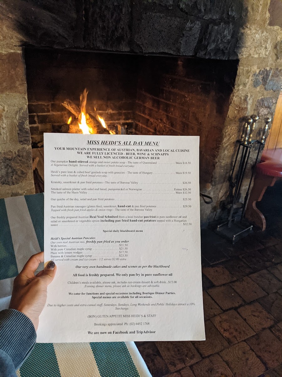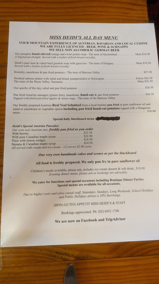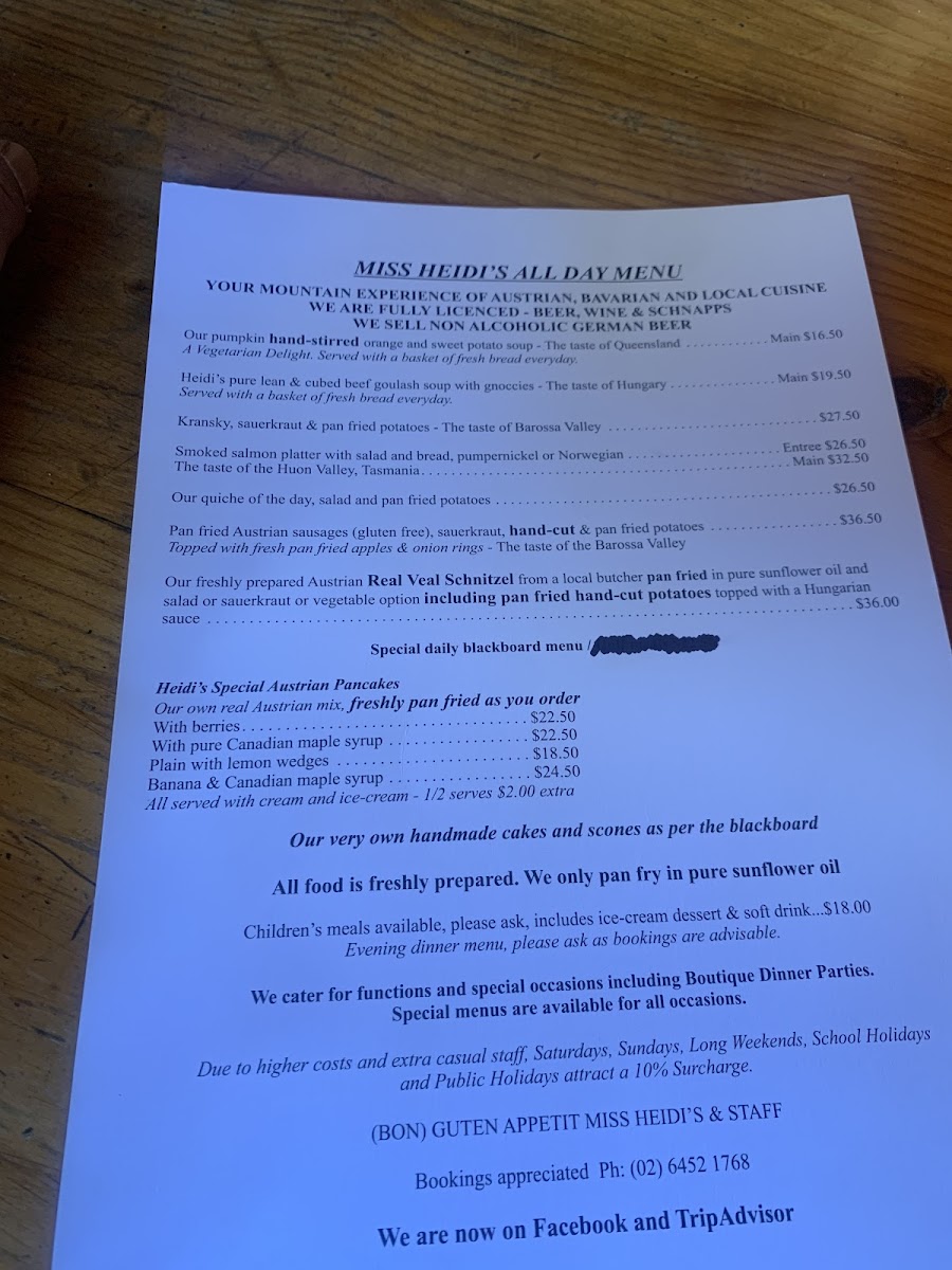 Located at Mt Gladstone Lookout near Cooma NSW, this cafe and coffee shop offers a menu featuring a variety of food and drink options inspired by Austrian and Central European cuisine. The menu is organized into several groups to cater to different dining occasions including breakfast, light meals, and casual dining.