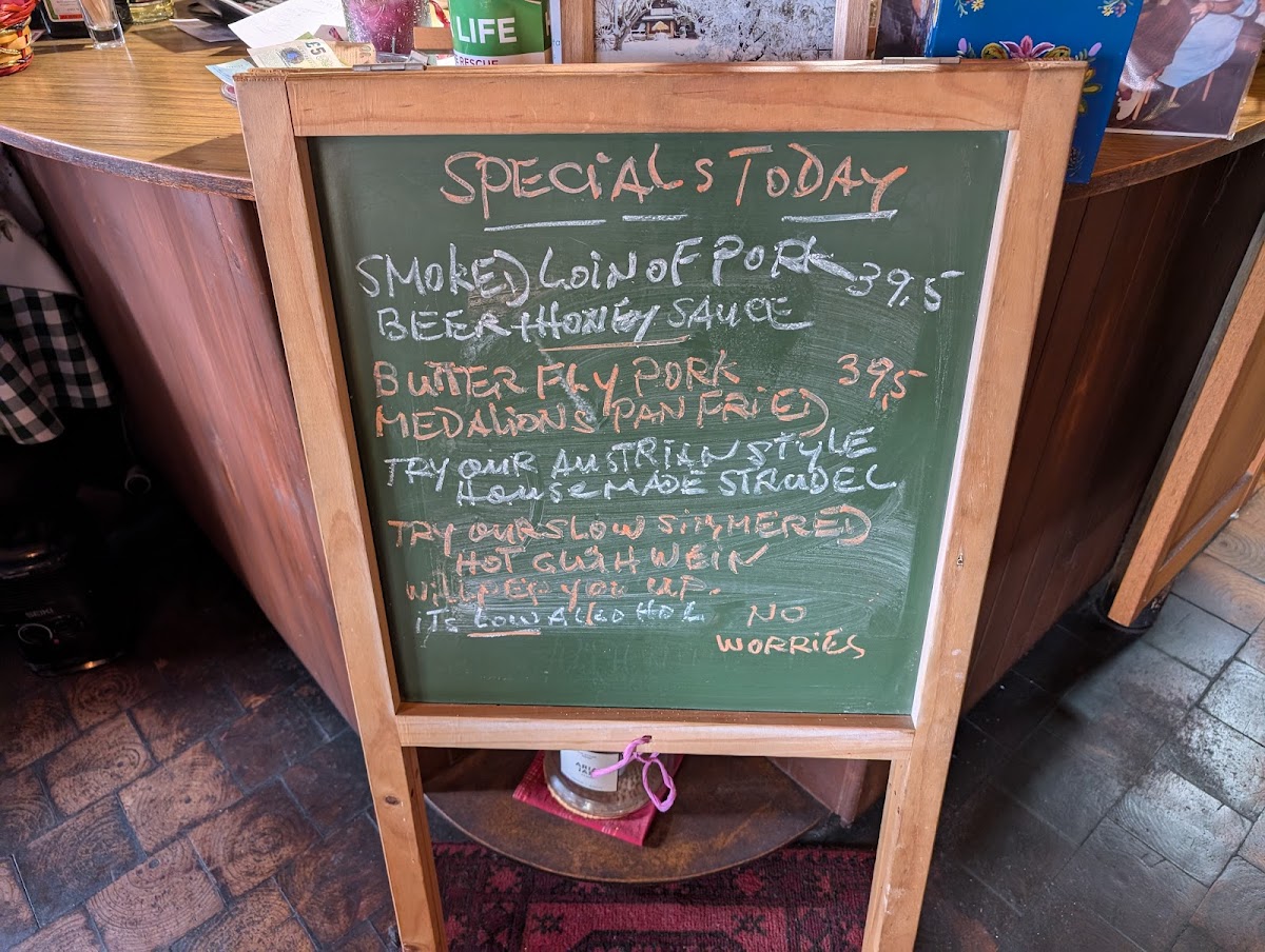 Light Meals and Snacks: The menu offers items such as smoked salmon platters served with salad and choice of bread, quiches accompanied by salad and pan-fried potatoes, and various soups including a lean beef goulash and a pumpkin, orange, and sweet potato soup. Some dishes emphasize traditional Austrian elements like pan-fried sausages served with sauerkraut and hand-cut potatoes.